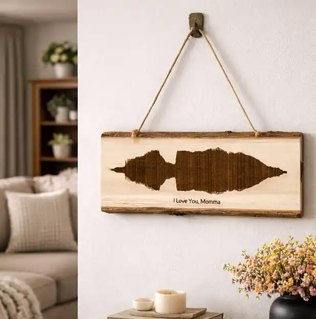 Sound wave art is engraved into this Basswood hanging sign.. Up to 30 characters can be engraved and centered under the Soundwave pattern. This piece is playable by tapping a compatible smartphone to the top right corner, which will open a link to play the audio you used to create the design. Due to the organic nature of wood, color, grain, and width will vary.