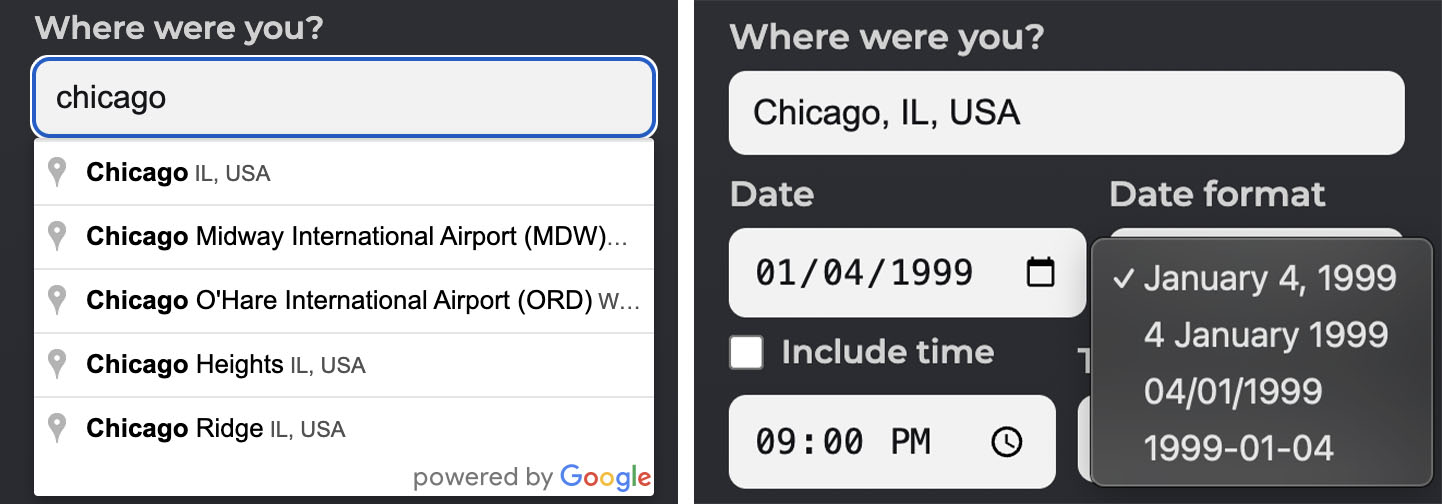 Step 1: Location. Begin by typing the location of your memory. Google will pull up a list for you to choose from. Once you select the location, you'll see the stars fill in. Select the date, then use the date format dropdown to choose the date layout for your art. If you'd like to select a specific time to be displayed, check the Include time check box.
