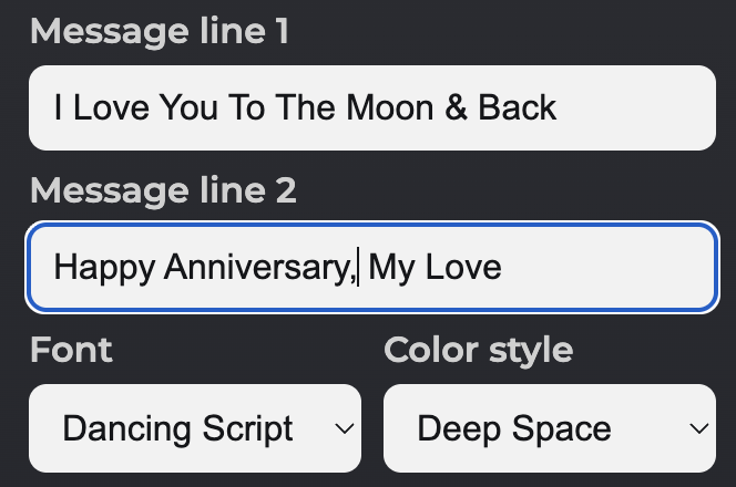 Step 2: Message. You can add up to 2 lines of text to your Star Map Art. Line one is limited to 30 characters, line 2 is 35 characters. Use the font box to select the font for your message.