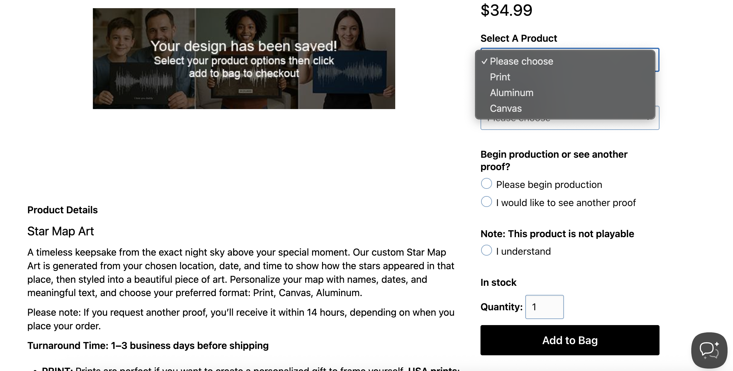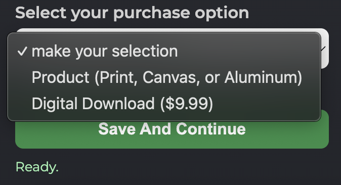 Step 5: Purchase. If you choose Product, once you click save, your design will be uploaded to our server, and you'll be directed to the product option page to choose from a print, aluminum, or canvas, as well as size, and then you can purchase your art.