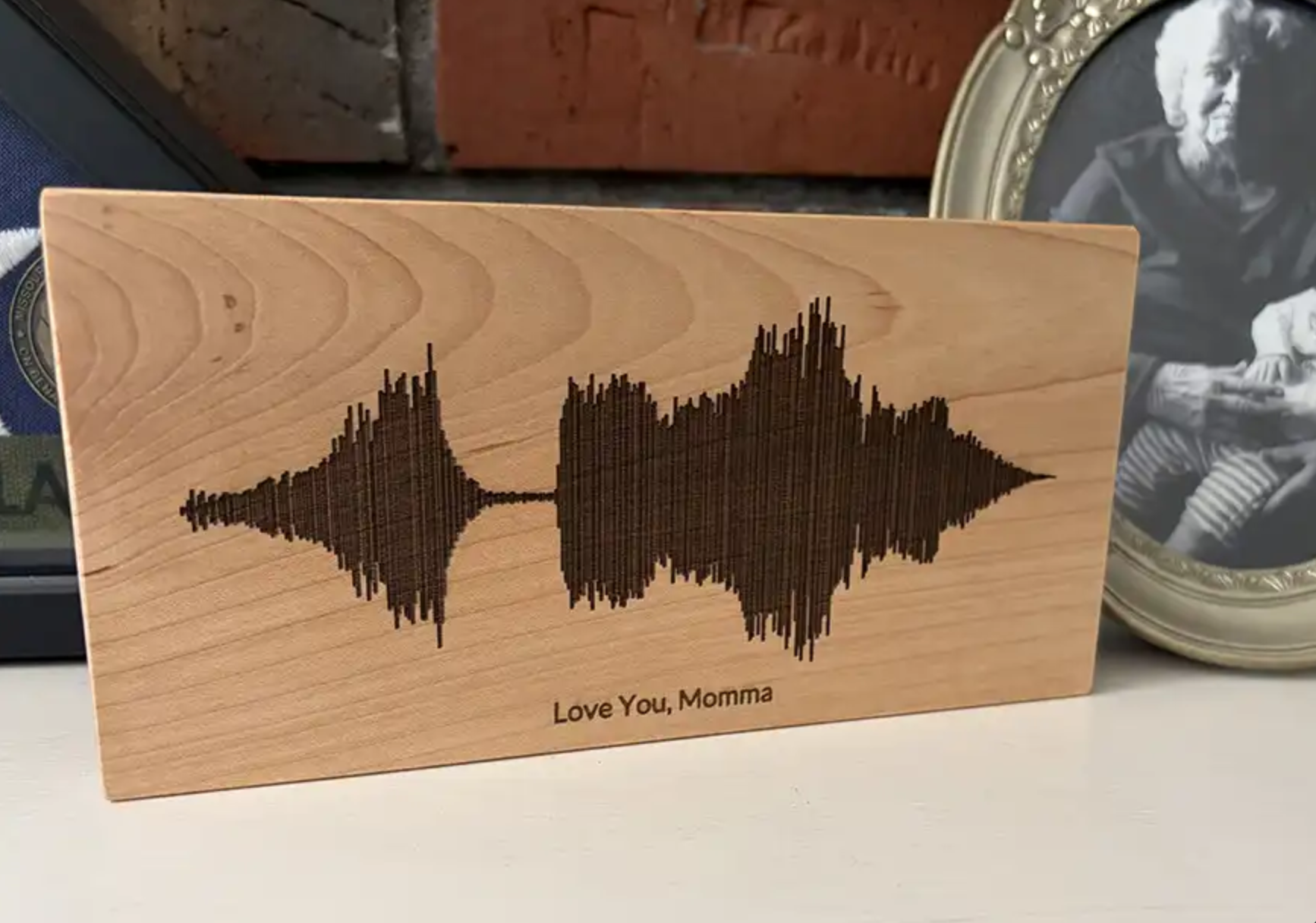 Sound wave art is engraved into maple. Up to 20 characters can be engraved and centered under the Soundwave pattern. This piece is playable by tapping a compatible smartphone to the top back corner, which will open a link to play the audio you use to create the design. Due to the organic nature of wood, color and grain will vary.