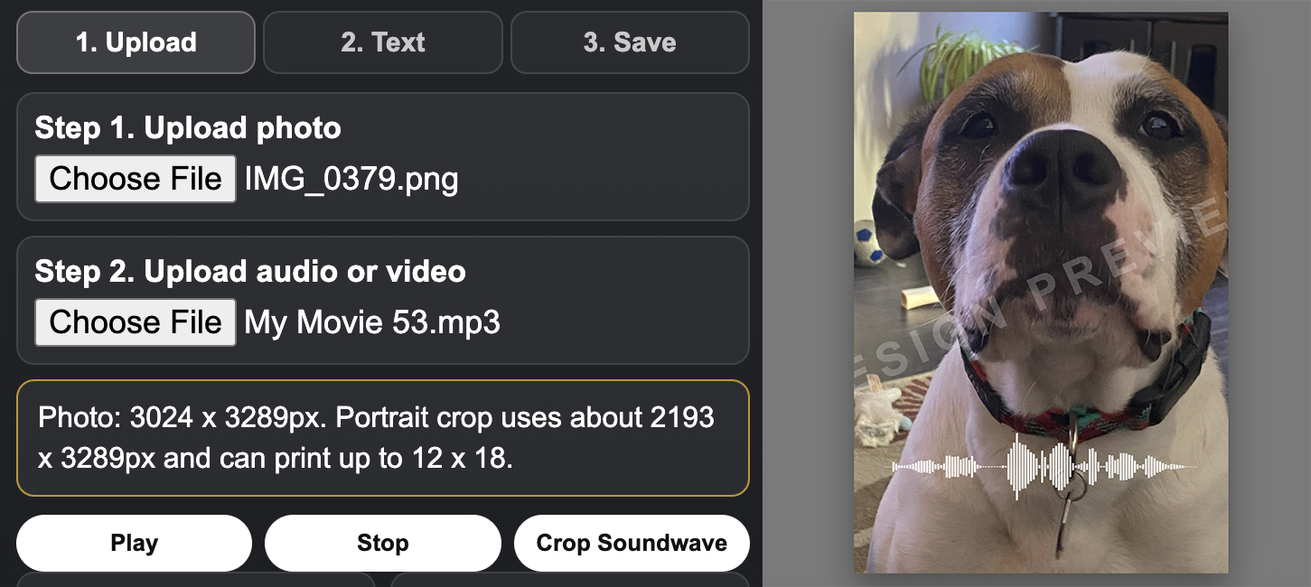 UPLOAD YOUR FILES: Upload a photo and an audio file or video. Your photo and Soundwave will appear in the display areas. The layout will depend on the orientation of the photo you upload. When you upload your photo, our design tool will show you the recommended print size based on the resolution of your photo. This will appear just above the play, stop, and crop buttons.