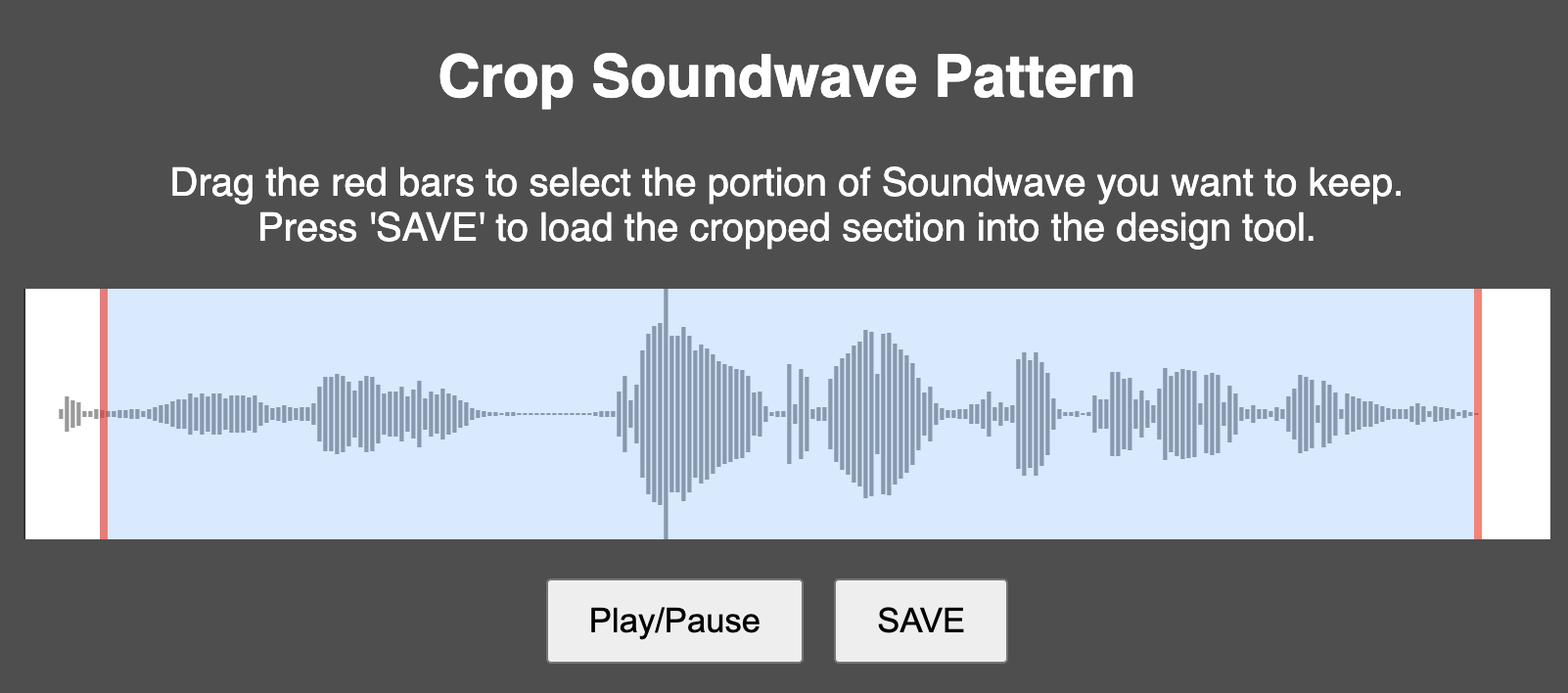 CROP SOUNDWAVE PATTERN: If you have some blank space at the beginning and end of your Soundwave pattern, you can crop it by clicking the Crop Soundwave button. Click on the red bars and slide them to crop your pattern, anything in between the two lines will be kept. When you click save the cropped pattern will display in your preview area. Important note: If you plan to add our app feature to play your art and you crop a portion of the audio that you want to play, make sure you upload your full audio or video file again AFTER you save your design in the third tab (don't re-upload it in step 1). You'll do this when you are redirected to the product options page after saving your full image.
