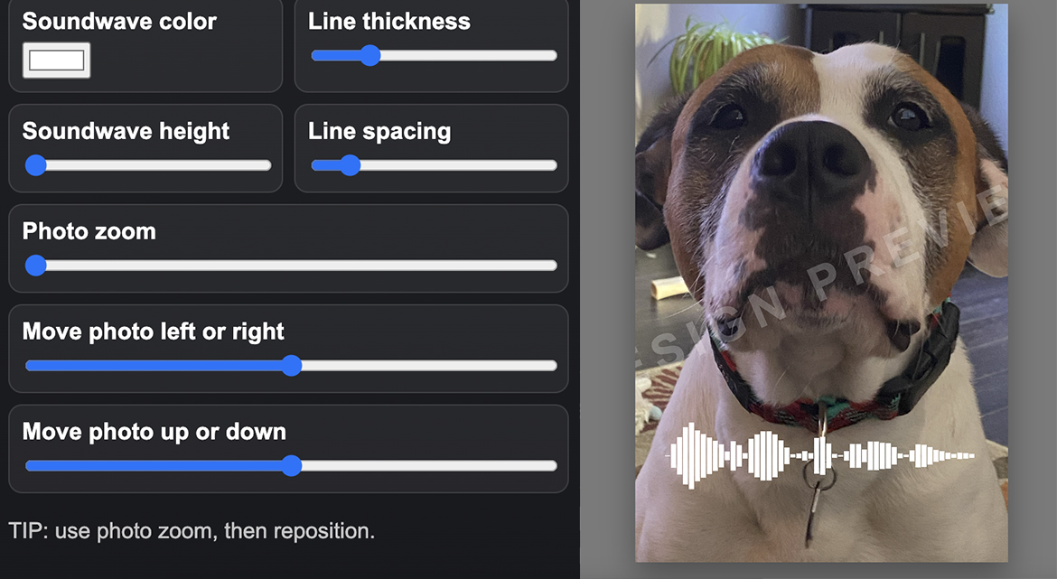 SOUNDWAVE AND PHOTO ADJUSTMENT: You can select the color of your soundwave, adjust the line thickness, height, spacing and photo placement in this section. Adjust the Soundwave controls until you are happy with the pattern. If you want to adjust the placement of your phot use the Photo zoom slider, then move the photo left, right, up, or down using those sliders.
