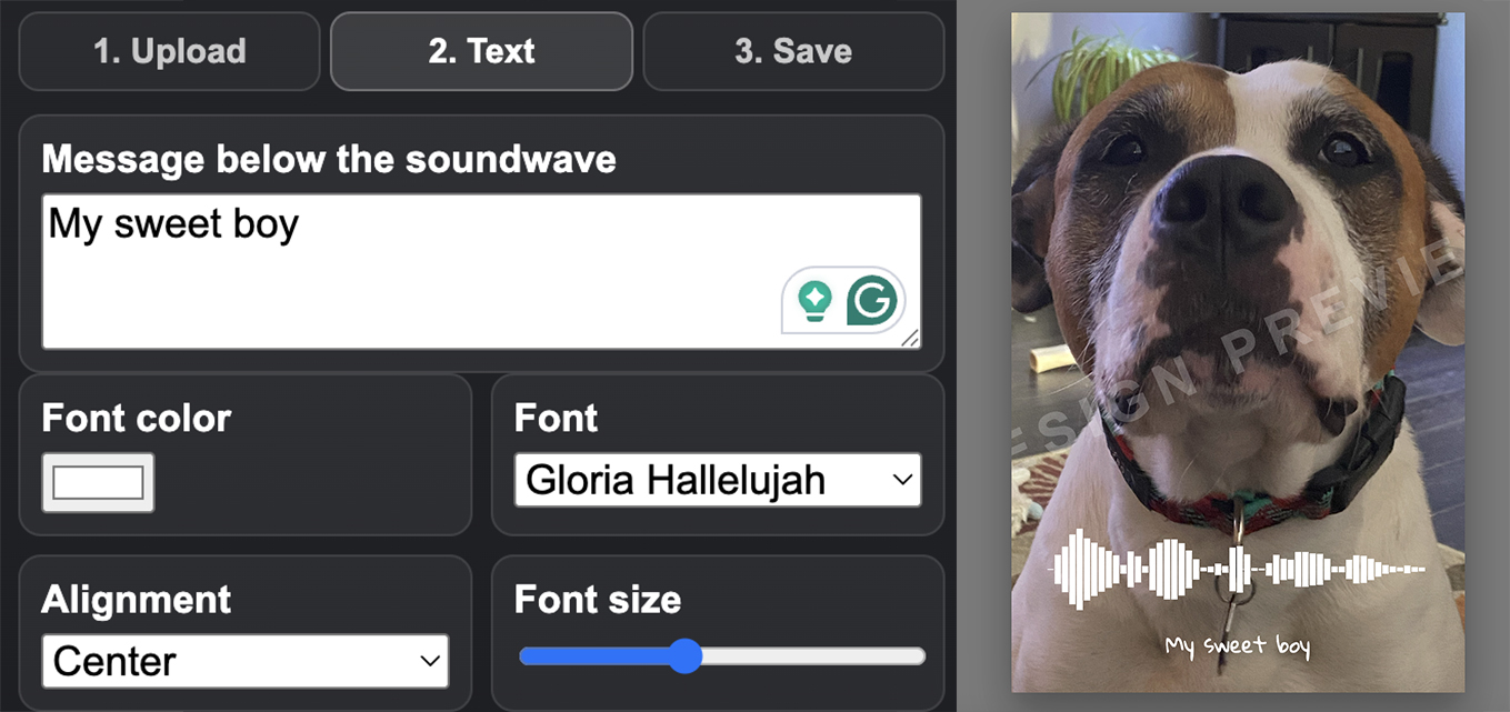 ADD A MESSAGE: Select tab 2 so you can type a message to be displayed below your Soundwave. The limit is three lines and 100 characters total. Press enter if you want to add a second line. Select your font color, choose from multiple fonts, align left, center, or right, and choose your font size.