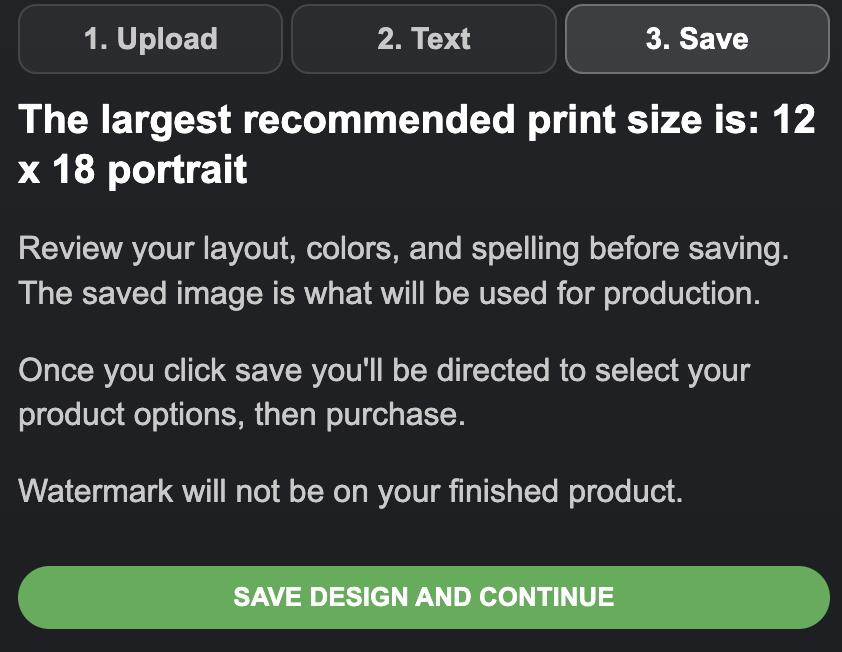 SAVE YOUR DESIGN: Go to tab 3 when you are finished designing your art. You'll see the recomended print size which is based on the resolution of the photo you uploaded. Remember this when you go to the product selection page so you select the size that will print best. Review your design and make sure everythings good and is spelled correctly as this is the exact image that will be used for production. When you click the save button it can take a minute or two for you to be redirected. This depends on how large the files are. Pleasae be patient.