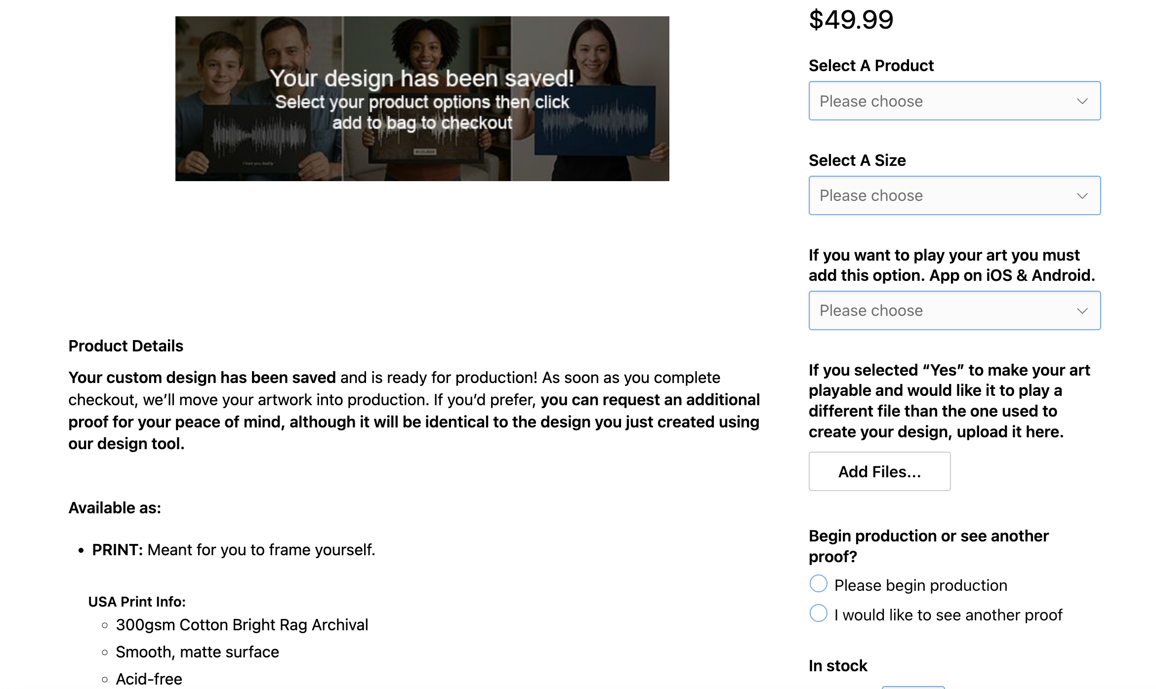 PRODUCT SELECTIONS AND PURCHASE: As soon as your files are uploaded you'll be directed to the product selection page.Use the side bar to select the product you want as well as the size (keep in mind the recommended print size). If you want to make your art playable with our Soundwave Art app you can add that here. If you do add our app feature and want it to play something other than the file you used to create your Soundwave pattern you can upload it here. You'll also have the option to send the order directly to product or you can request another proof. If you request a proof it can take up to 14 hours for us to send it to you. This depends on the time of day you order. Most of the time it is much quicker. When you are finised with your selections click the Add to Bag button to complete your purchase.